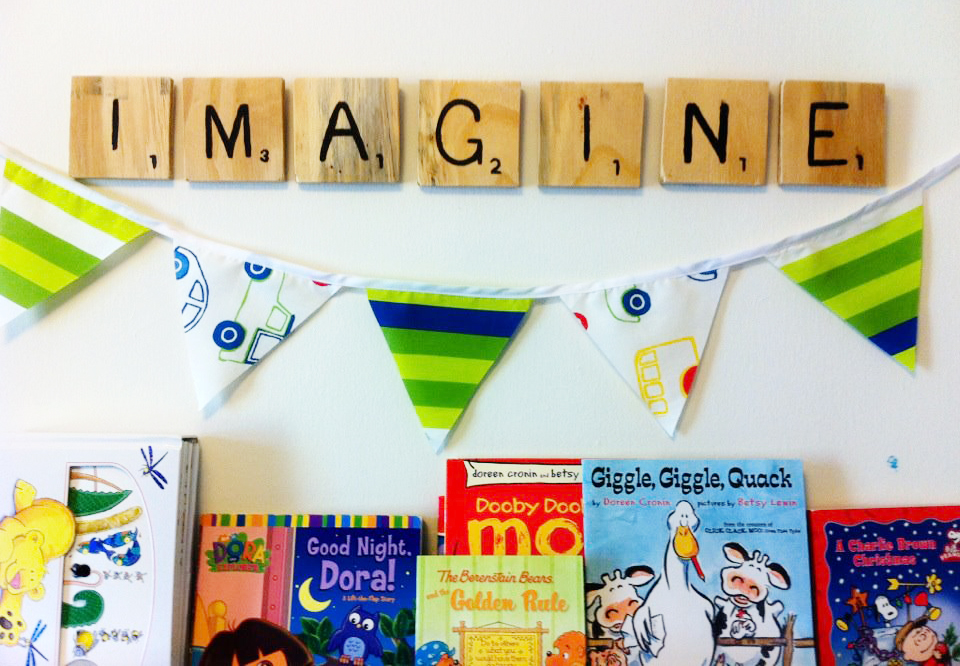 Then last but not least... I was so inspired by these large scrabble wall tiles from Too Much Time On My Hands that I could not wait to make some of my own to decorate my boys' room with. And what better word to go over a book shelf?